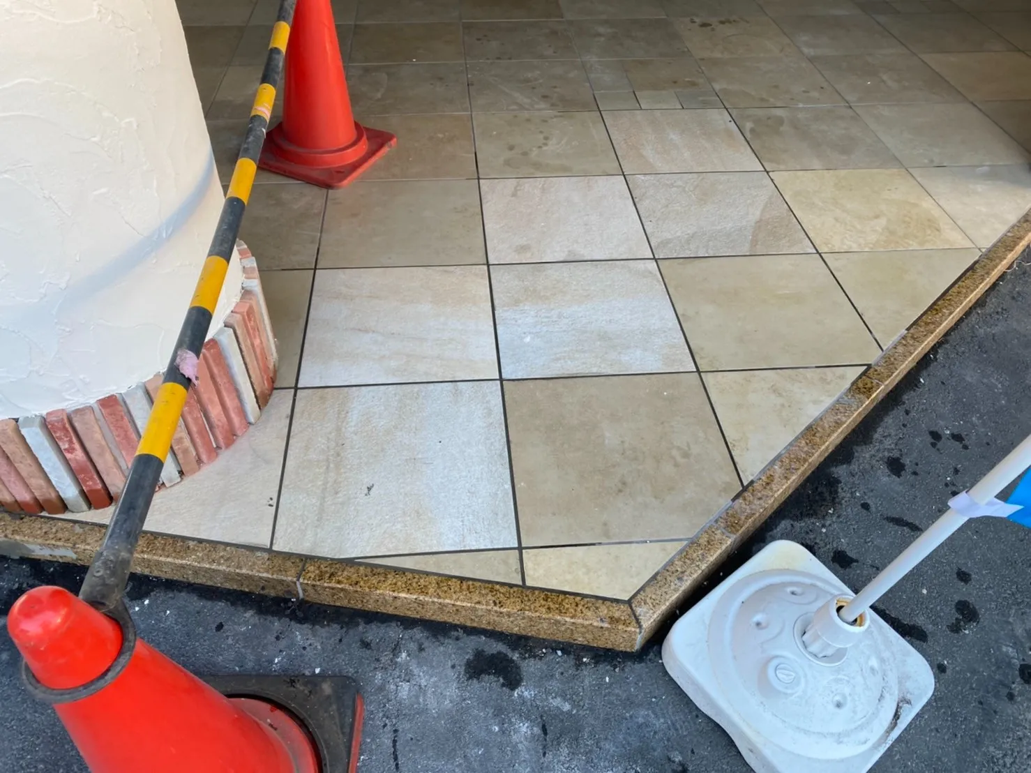 車をぶつけてしまったらしく柱が抉れて、タイルにも亀裂が・・・・