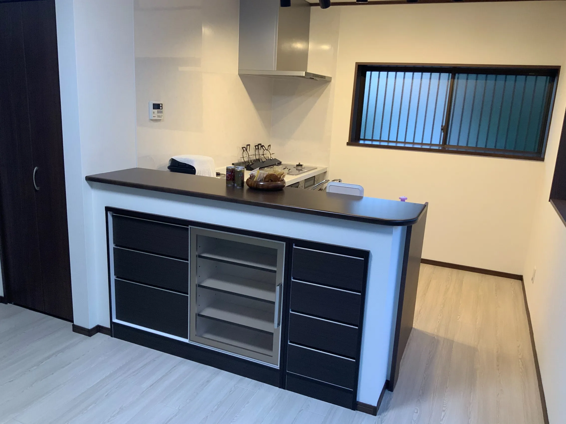 1Fキッチンは元々壁付けでアイランド型に施工して床・壁も一新!